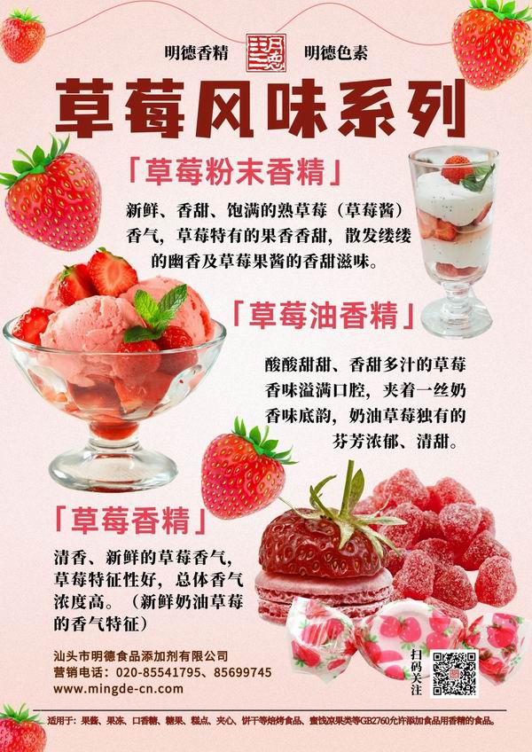 在草莓香精領(lǐng)域我們數(shù)十年潛心專研,迎合市場需求,滿足消費(fèi)者喜好,汕頭市明德食品添加劑有限公司,推出了多種風(fēng)味的草莓香精,如:草莓醬風(fēng)味、奶油草莓風(fēng)味、新鮮草莓風(fēng)味、熟草莓風(fēng)味等。