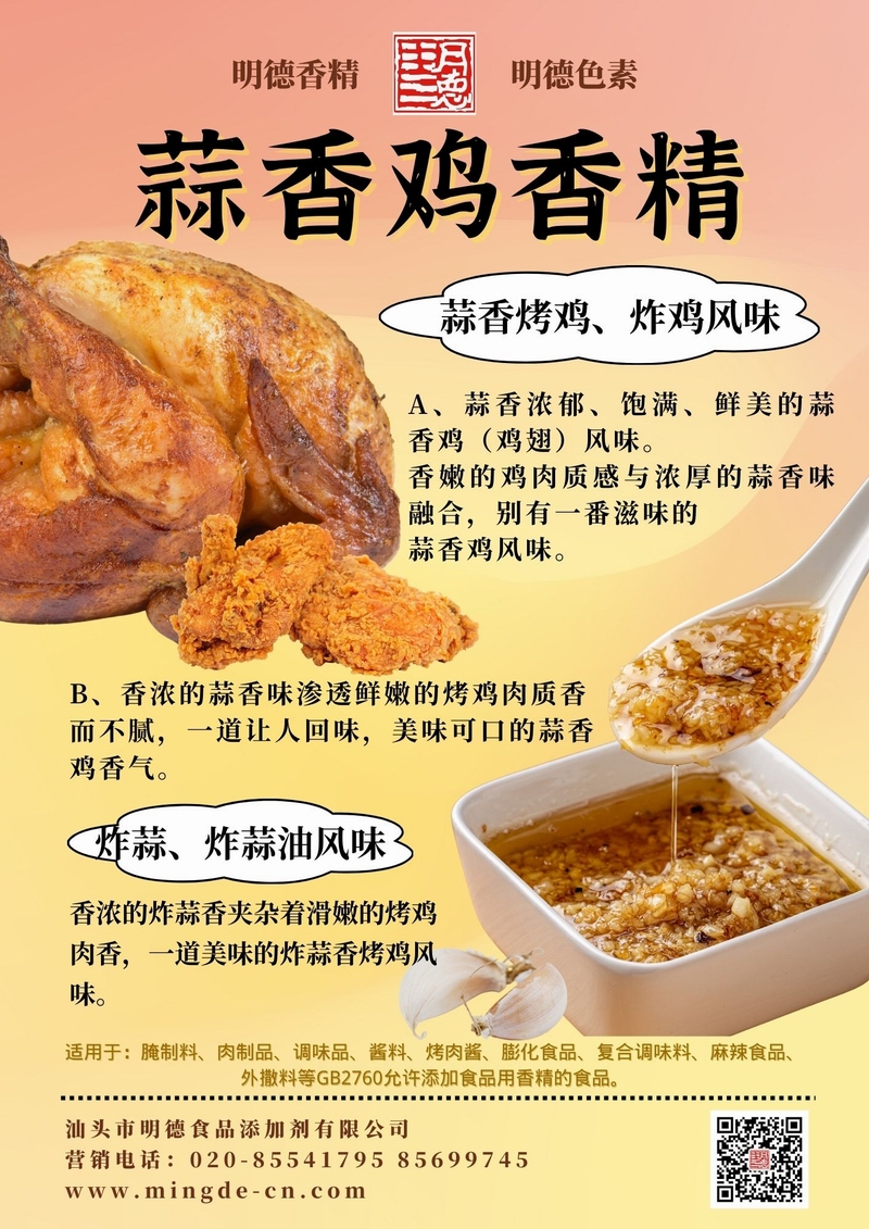 明德蒜香風(fēng)味系列香精 多級(jí)蒜香 覆蓋多場景汕頭市明德食品添加劑有限公司推出的蒜香風(fēng)味系列香精,覆蓋水溶性、油溶性與粉末等多種形態(tài),既能呈現(xiàn)新鮮大蒜、炸蒜、熟蒜油等不同調(diào)性,又兼顧耐溫與留香表現(xiàn),適用于醬料、肉制品、調(diào)味品、休閑零食及復(fù)合調(diào)味等B端應(yīng)用。以下為本系列核心單品與香氣描述