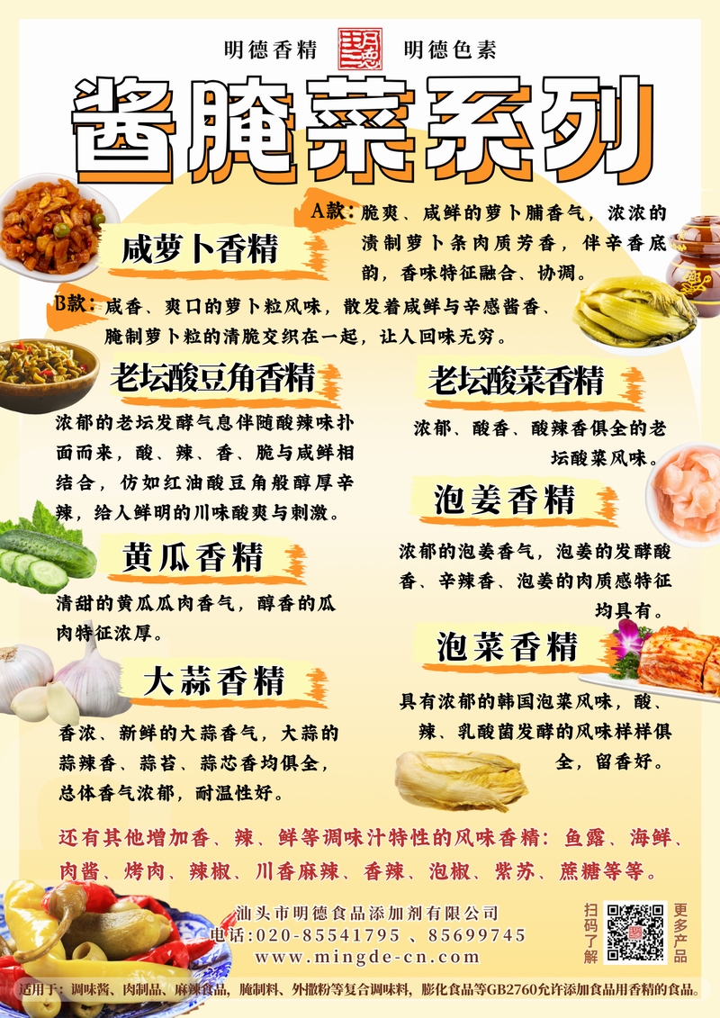 汕頭市明德食品添加劑有限公司的醬腌菜系列香精,涵蓋咸蘿卜、老壇酸豆角、老壇酸菜、黃瓜、泡姜、泡菜、大蒜等多種品類。香氣真實、留香穩(wěn)定,適用于鹵味熟食、腌制菜肴、復合調(diào)味料、調(diào)味醬、速食及方便食品等B端應用,幫助工廠打造具有地道風味特征的產(chǎn)品。